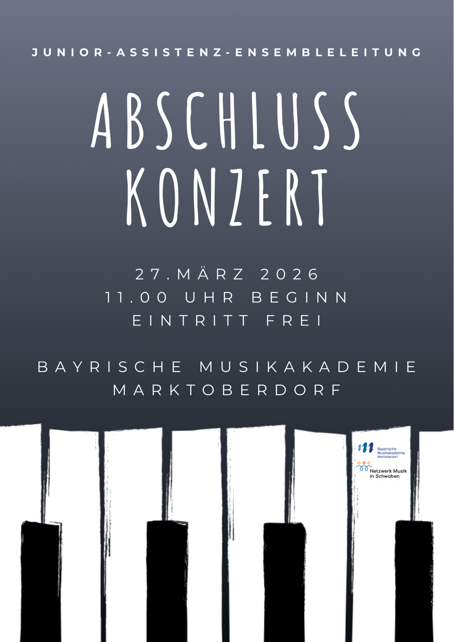 Der Kurs Junior-Assistenz Ensembleleitung an der Bayerischen Musikakademie Marktoberdorf geht in seine dritte und abschließende Phase. Nach zwei erfolgreichen Kursphasen im November und Januar findet am 27. März 2026, 11 Uhr ein öffentliches Abschlusskonzert statt, bei dem die Jugendlichen selbst die musikalische Leitung übernehmen.