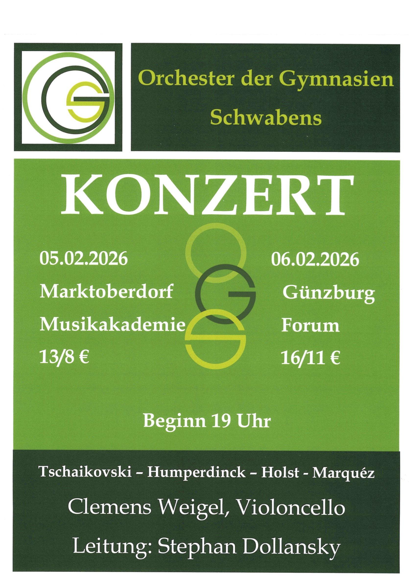 Zum Abschluss ihrer Arbeitsphase laden die Schülerinnen und Schüler zum Konzert. Dieses Jahr haben sie den Cellisten Clemens Weigel als Solist gewinnen können. Die Leitung liegt bei Stephan Dollansky.